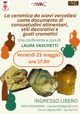 La dottoressa Laura Vaschetti tratterà “La ceramica da scavi vercellesi come documento di consuetudini alimentari, stili decorativi e gusti cromatici”