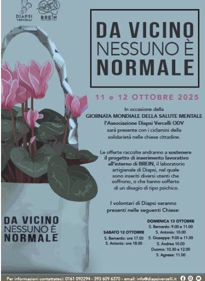 “Da vicino nessuno è normale” è il titolo della raccolta fondi di Diapsi Vercelli in occasione della Giornata Mondiale della Sanità Mentale.