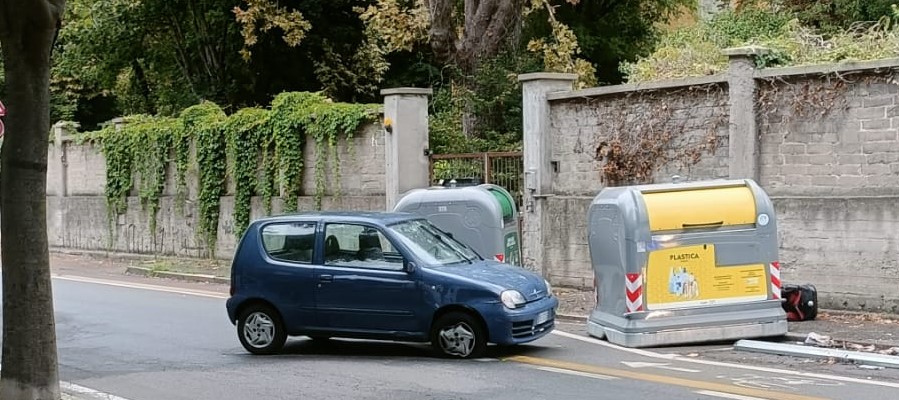 L’utilitaria che si vede nelle illustrazioni è finita – per motivi che sono al vaglio della Polizia Locale, tempestivamente giunta sul posto – contro i cassonetti della raccolta plastica e vetro.