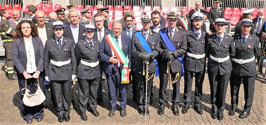 Un momento bello, si diceva: Piazza Zumaglini popolata dei 60 Vigili che hanno ricevuto la “placca”, il distintivo di Agente, dalle mani dei rappresentanti delle rispettive Amministrazioni pubbliche presso cui presteranno servizio.