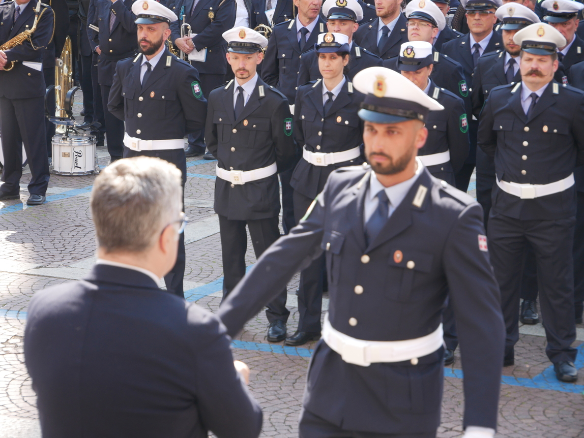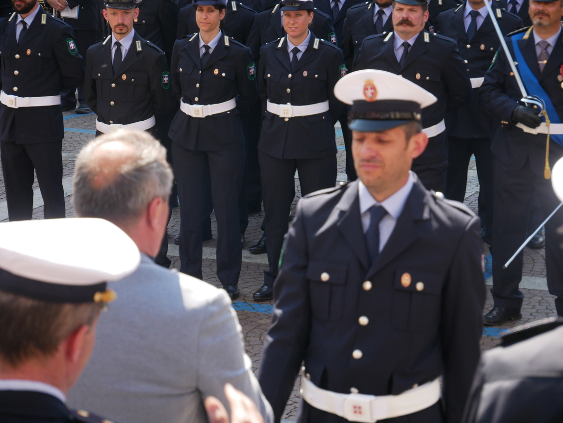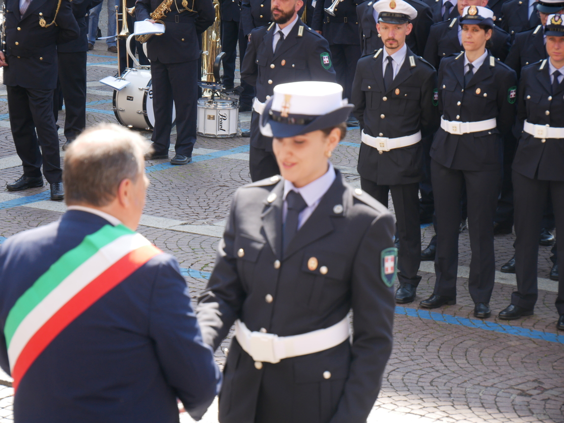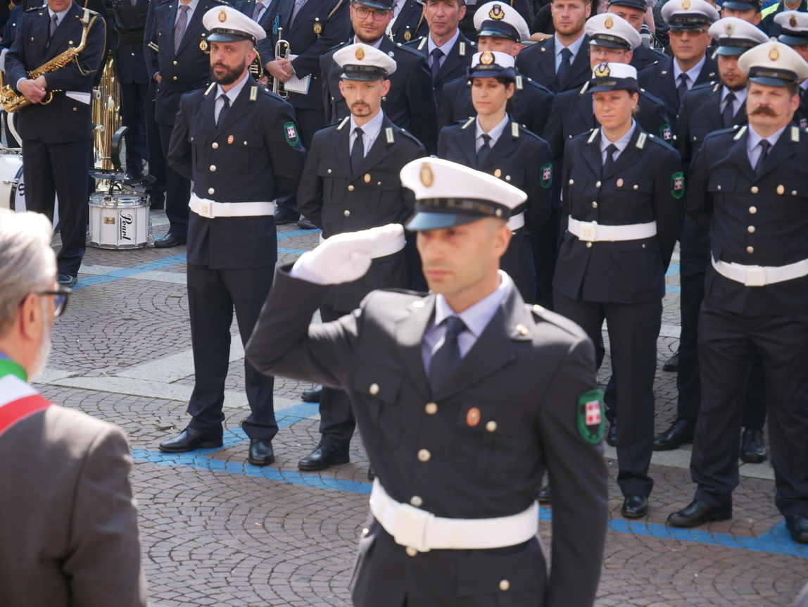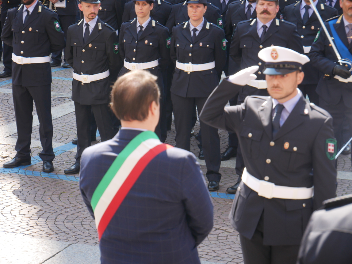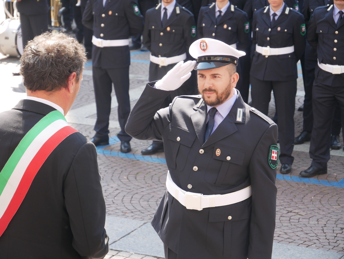 Un momento bello, si diceva: Piazza Zumaglini popolata dei 60 Vigili che hanno ricevuto la “placca”, il distintivo di Agente, dalle mani dei rappresentanti delle rispettive Amministrazioni pubbliche presso cui presteranno servizio.