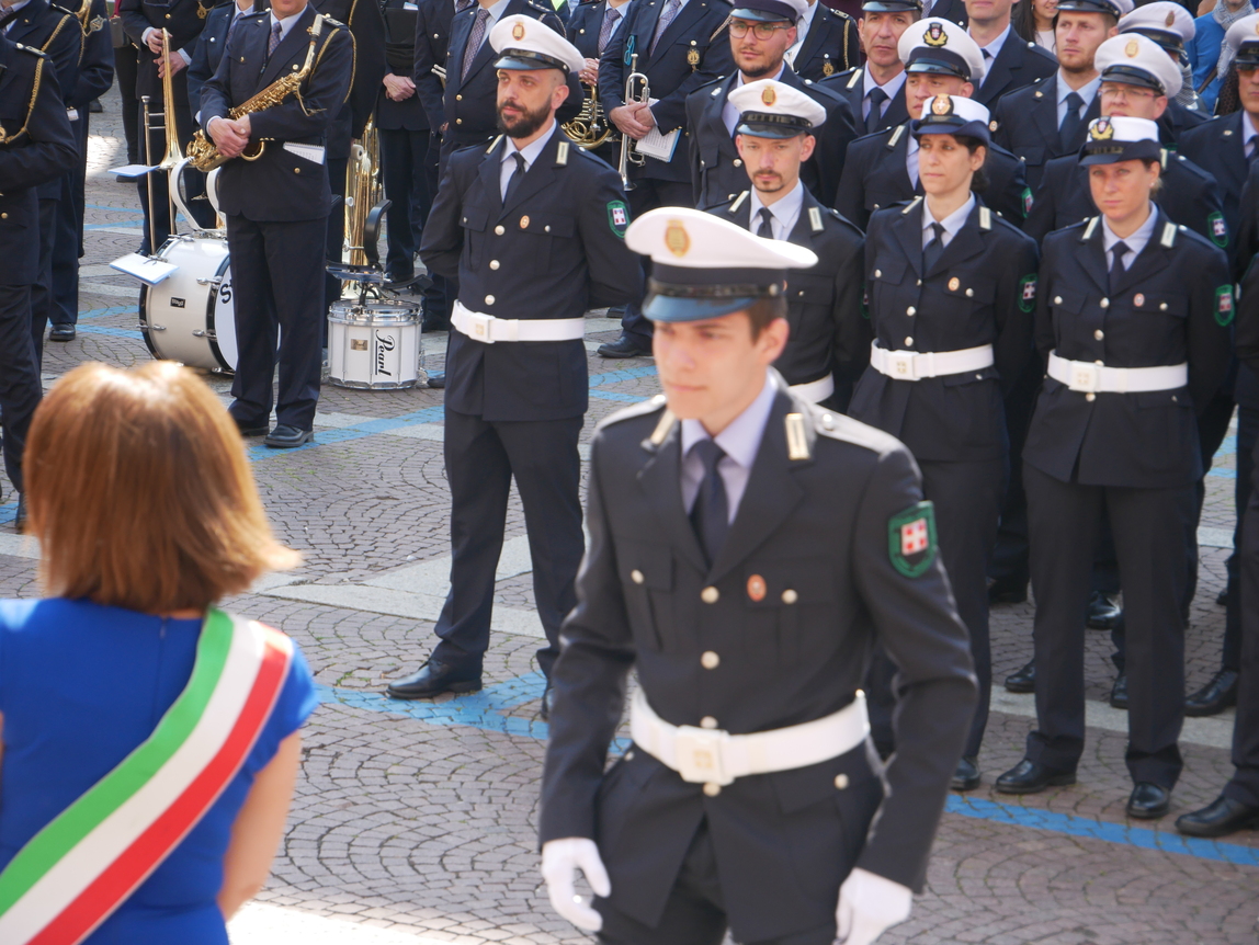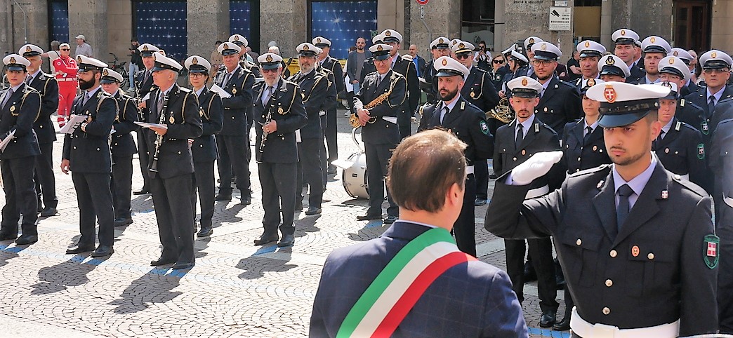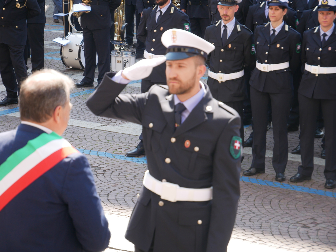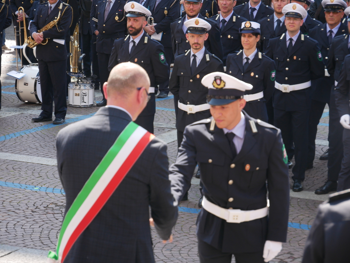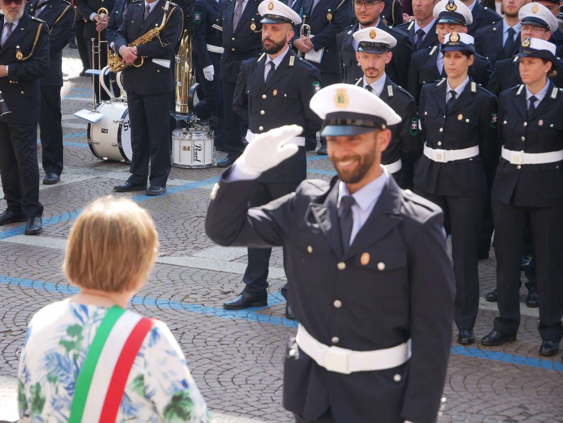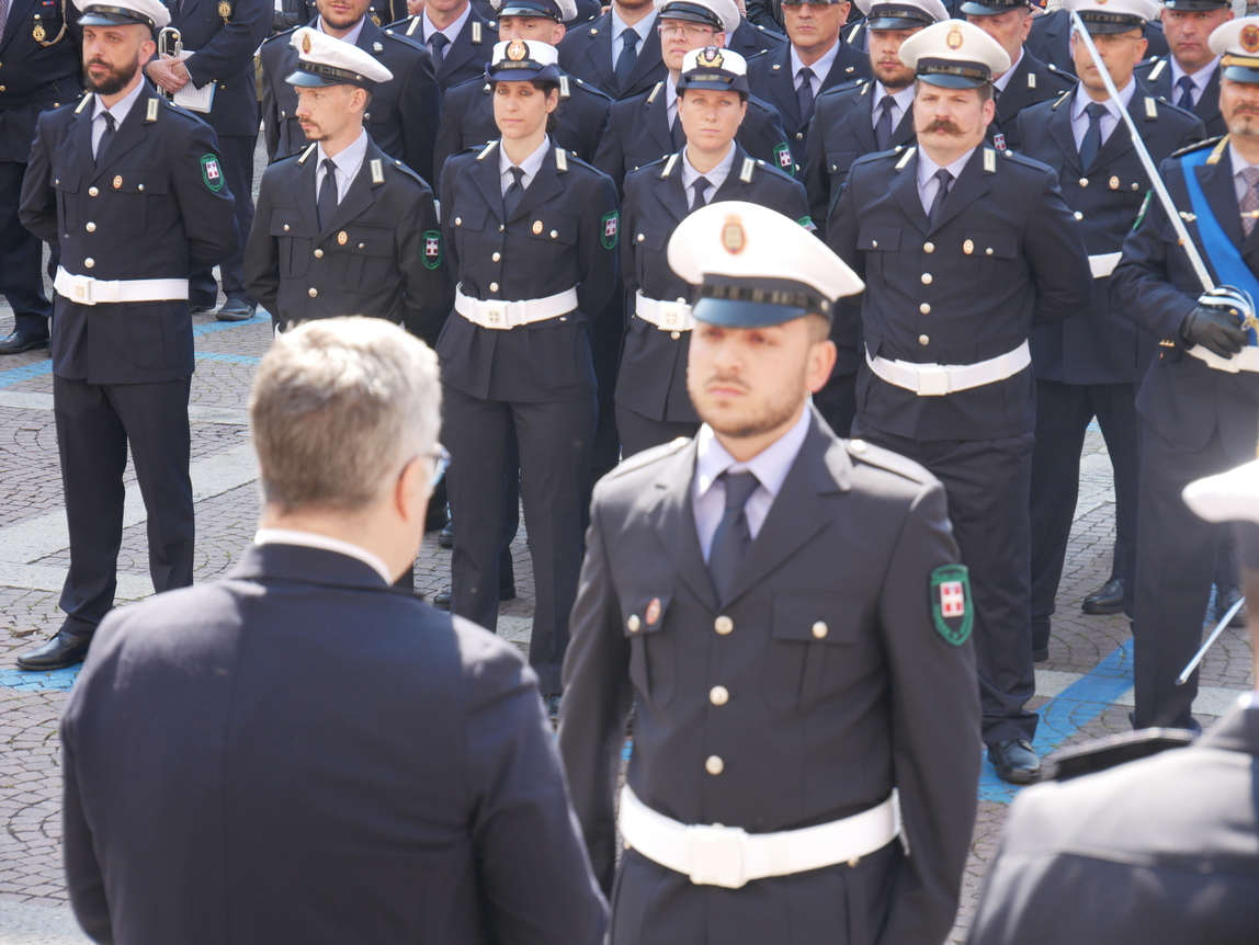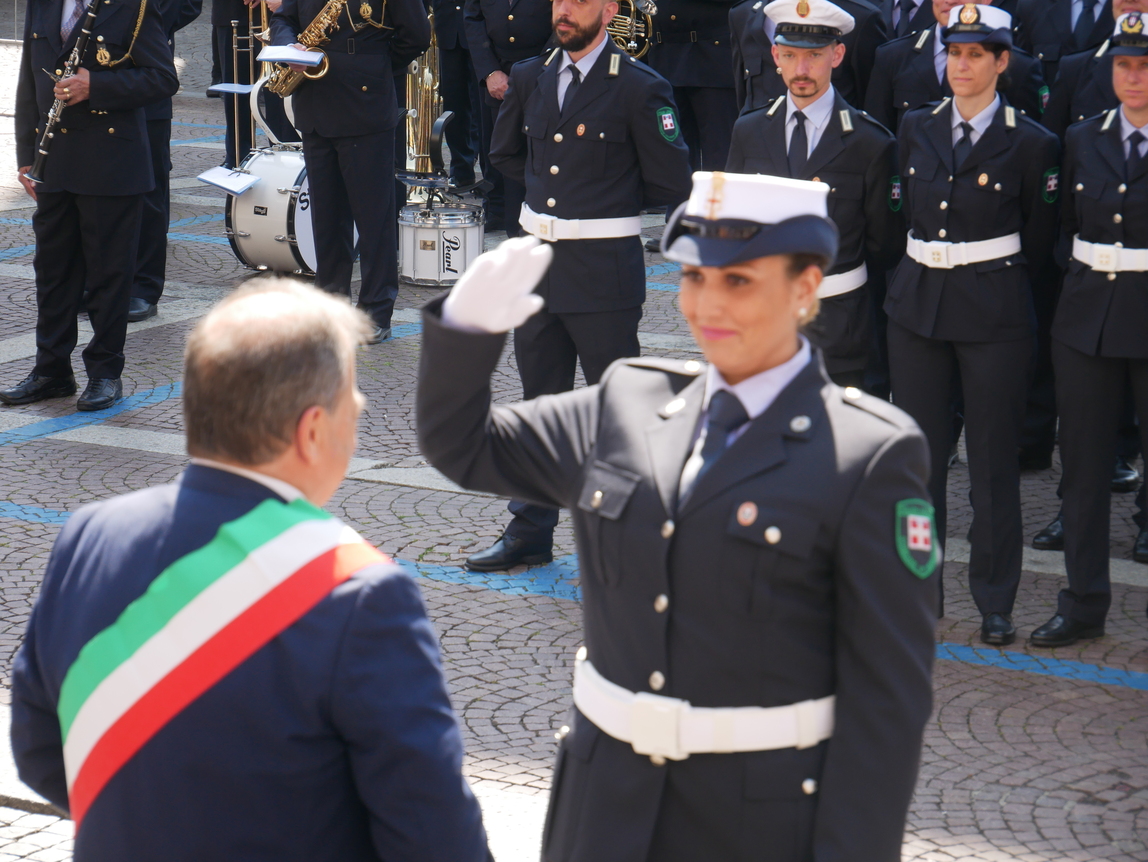 Un momento bello, si diceva: Piazza Zumaglini popolata dei 60 Vigili che hanno ricevuto la “placca”, il distintivo di Agente, dalle mani dei rappresentanti delle rispettive Amministrazioni pubbliche presso cui presteranno servizio.