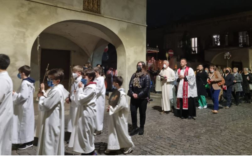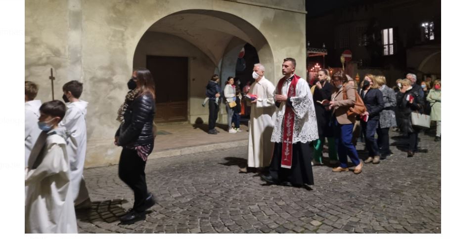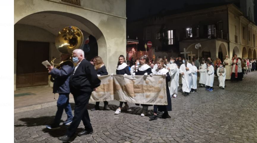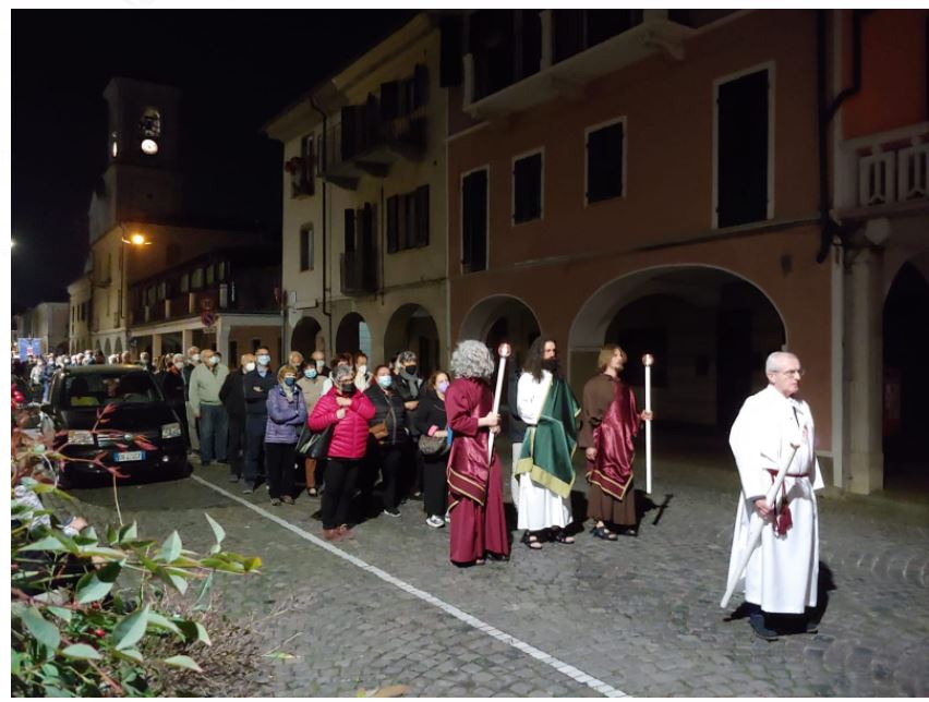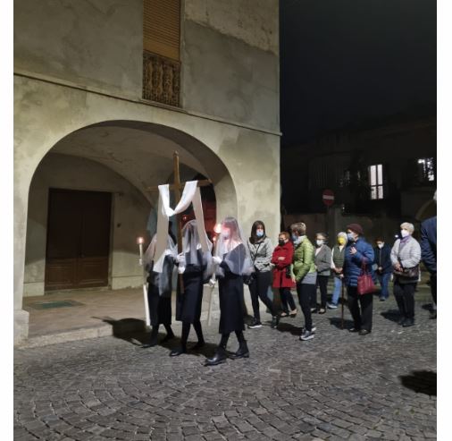 Sempre molto partecipata, la processione del Venerdì Santo a Verolengo, riunisce il popolo di Dio nella commemorazione della morte di Gesù, evento che tuttavia prepara, con l’oltraggio della Croce, la signorìa della Pasqua.