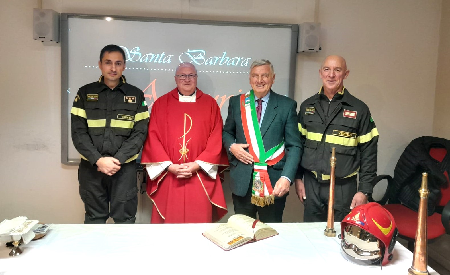 Infine, un accenno ancora alla giornata di ieri, quando – come dimostra questa fotografia – il Comandante Bolognese ha fatto visita al Distaccamento di Varallo Sesia – Roccapietra, accolto dal Sindaco Arch. Pietro Bondetti: e, per la cronaca, non va dimenticato che Santa Barbara sia anche Patrona degli Architetti, rappresentati oggi in S.Andrea dal Presidente dell’Ordine provinciale, Arch. Marina Martinotti.